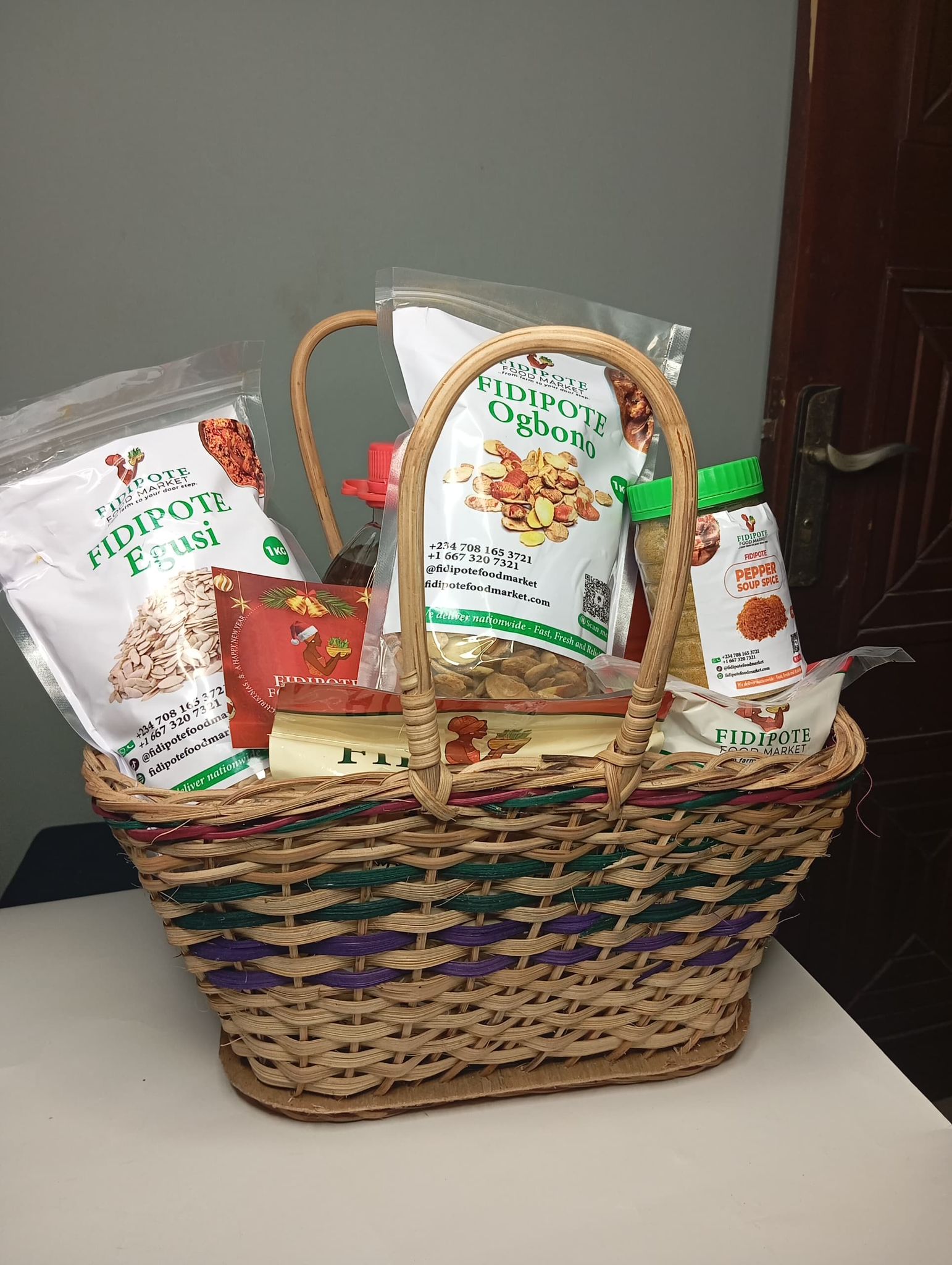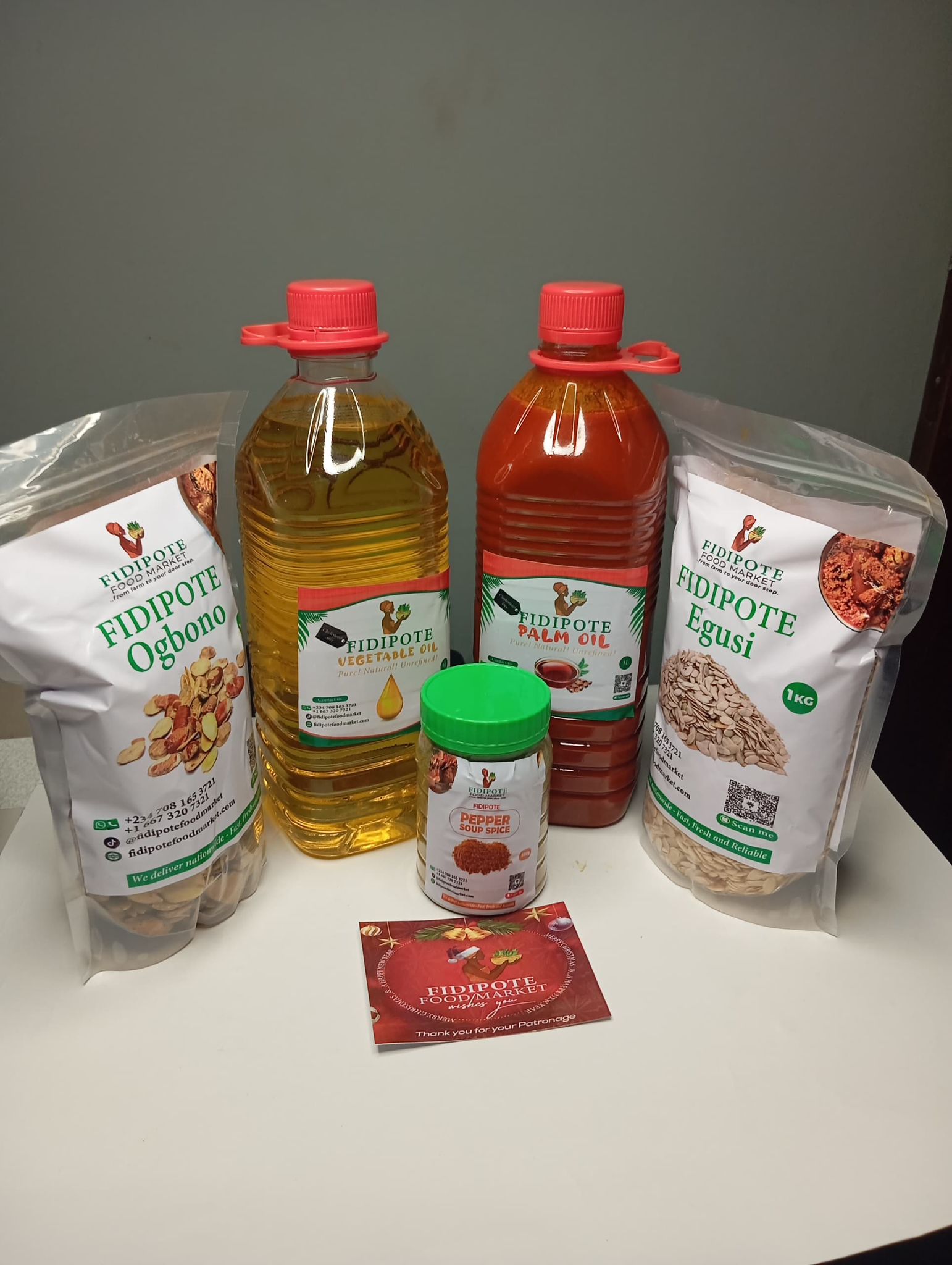 2kg rice 1.5kg beans 1.5kg ijebu garri 3 liters of palm oil 1kg ogbono 1kg Egusi 3 liters vegetable oil 500g pepper soup spice